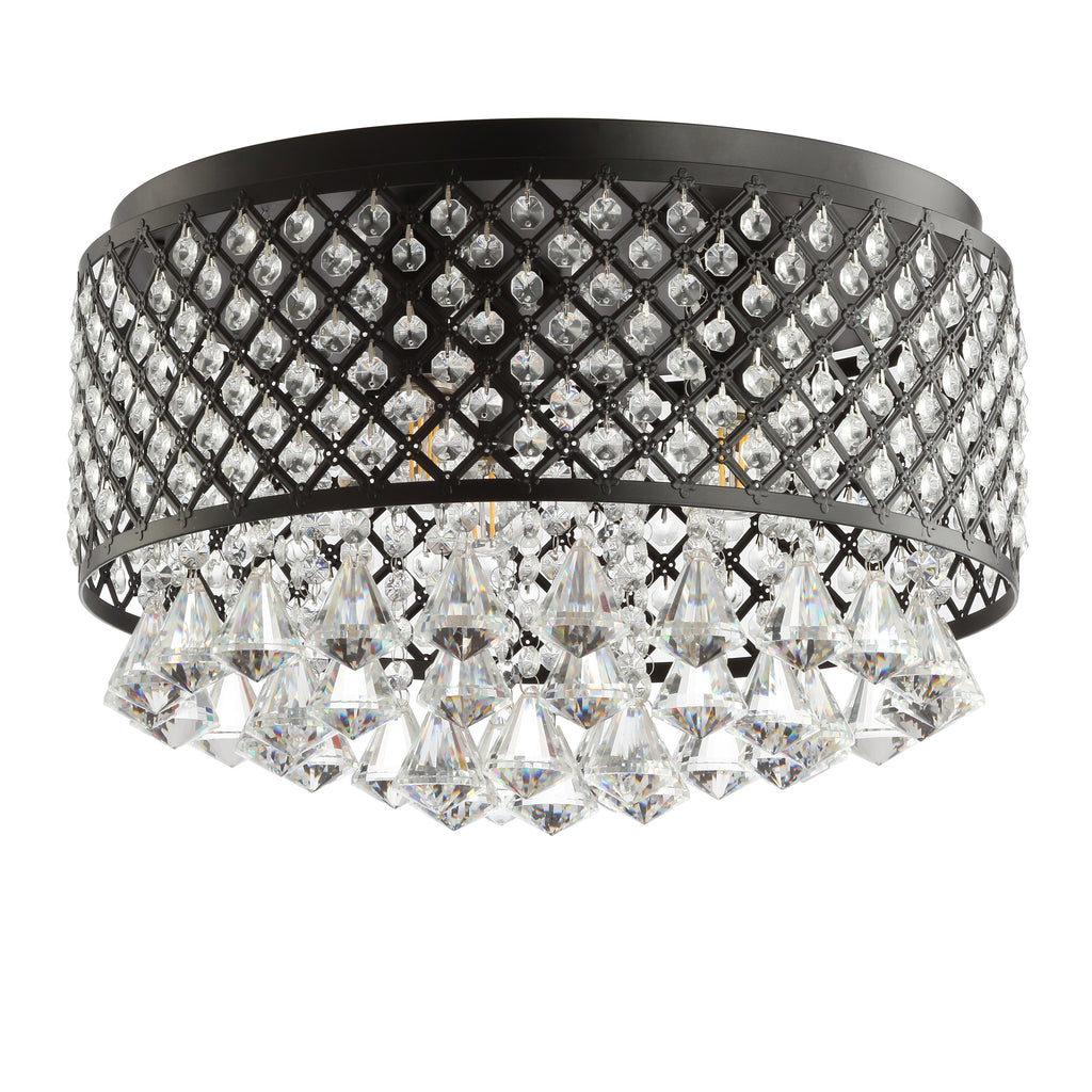 Add some sparkle to your ceiling with our modern, flush-mount light fixture. With faceted crystals set into a chic diamond trellis of black metal and a collection of crystal drops, this light fixture adds glamour to your hallway, bedroom or bathroom. This 11 5" tall light fixture is large enough to fit ceilings 8 to 10 feet high.