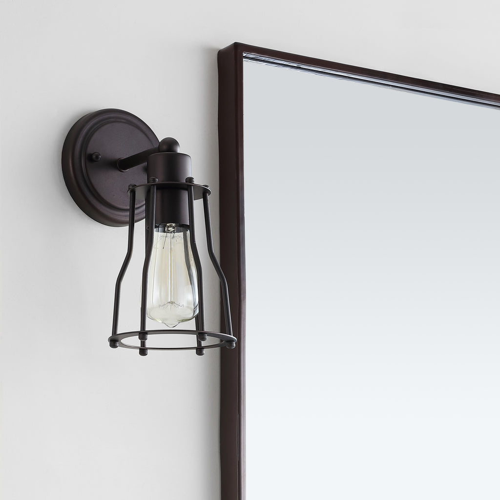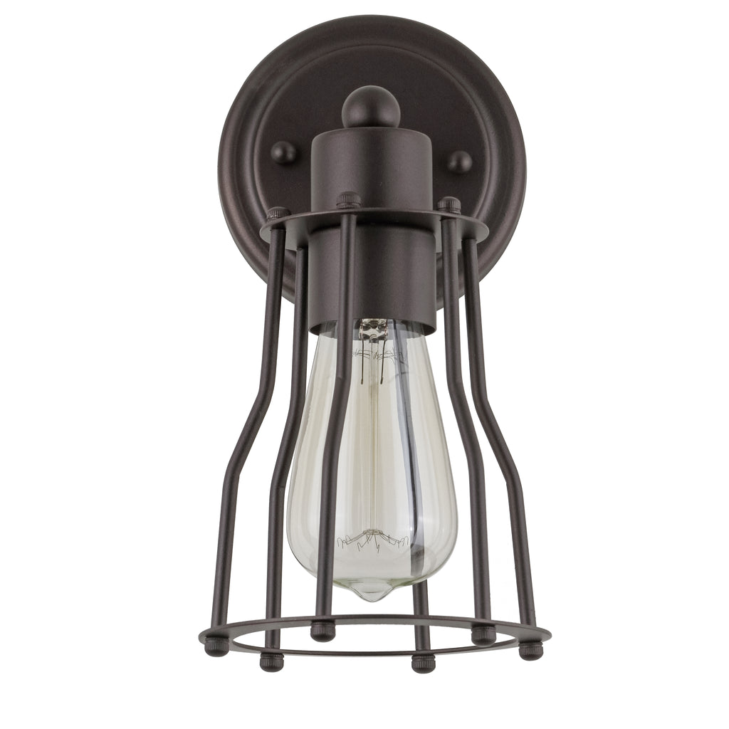 Define your bathroom or vanity space with the handsome industrial look of this dark bronze sconce, which can be hung in either direction according to your preference. This classic industrial cage bath light features a hand-worked orb-plated frame and round wall plate in an industrial finish. Edison-inspired bulbs add a vintage touch within the fixture, while the machined details of the shade cage evoke the turn of the century, when exposed bulbs were in vogue as only the most affluent households had upgraded to electricity from candlelight. This trend-forward, yet classic style is sure to be a classic for another century to come.
