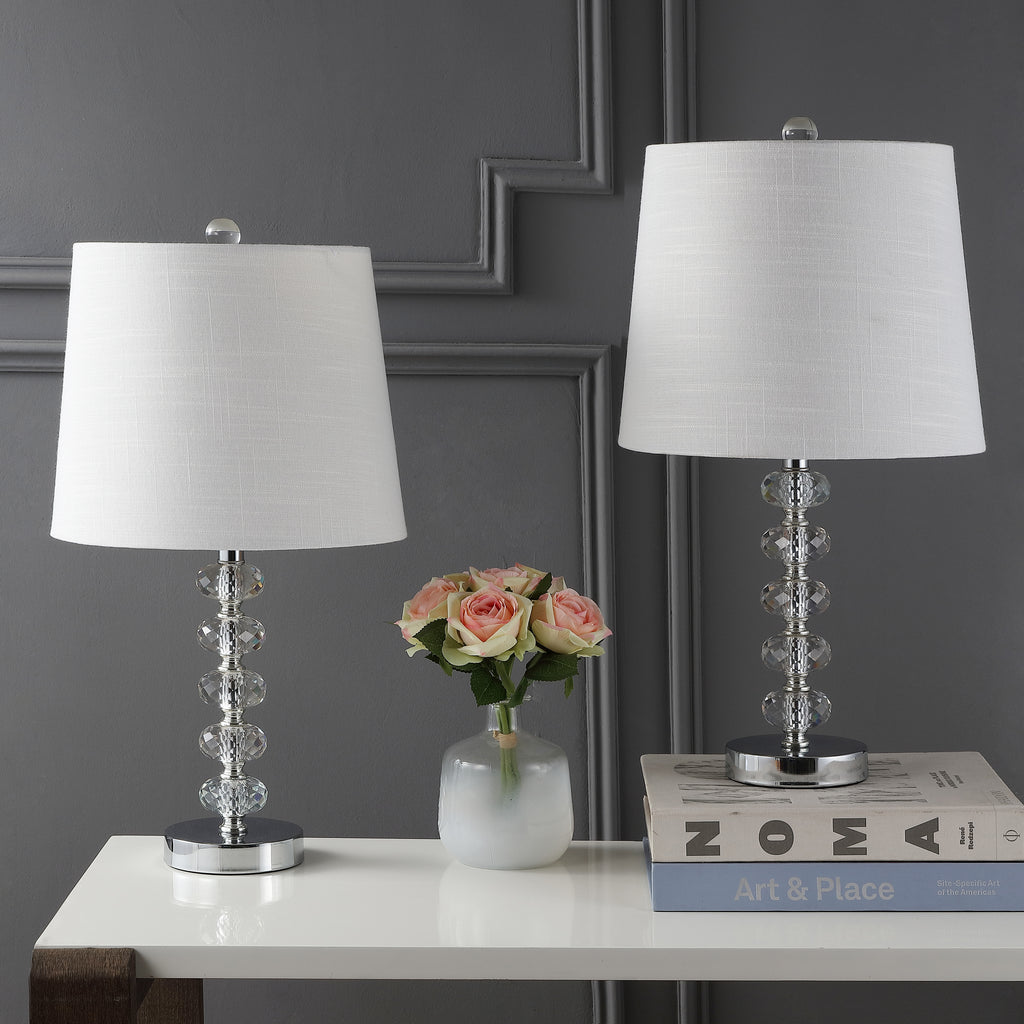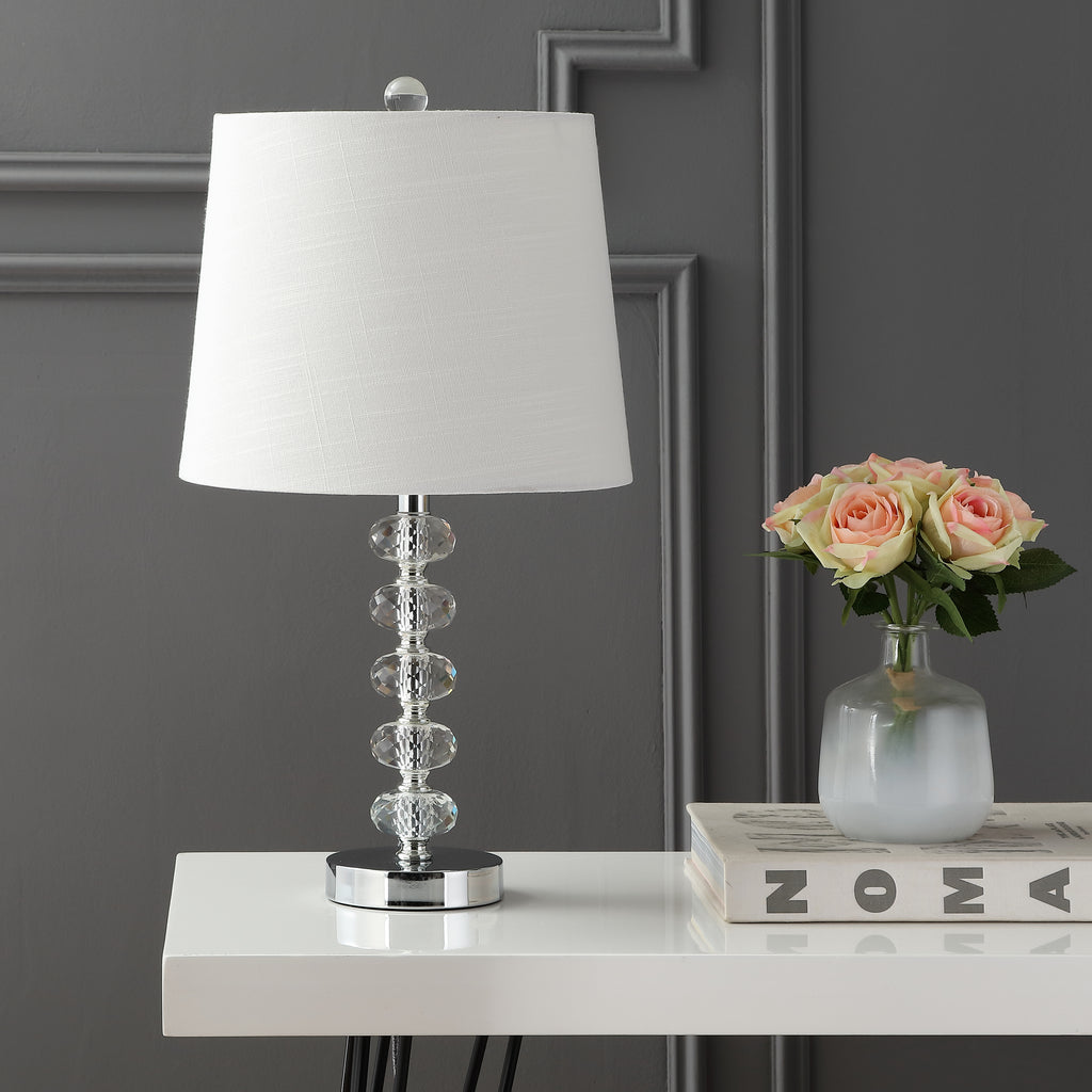 Modern yet timeless, the faceted crystal orbs on the base of this 22" high table lamp will brighten any corner with style and light. With its smaller scale, you'll make a statement by adding one on either side of a console or buffet for extra light, or use one to give your desk a designer touch with this updated take on a classic style. Crafted of a lead crystal base and finial, it's finished with a bright white drum shade.