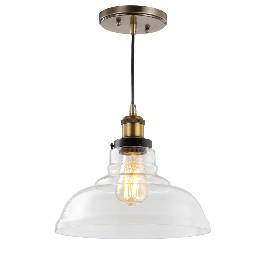 Traditionally made of metal, this pendant takes the Farmhouse look into more elegant territory with a glass shade and brass components. With an 11" opening, the large size is perfect in a pair or trio over a kitchen island, but also adds a real farmhouse feel when paired with shiplap over a dining table. Whether an industrial restoration, ranch style, or contemporary classic-style home, you'll love how the brass hardware and unobstructed glow from the bulb create warmth in any space.