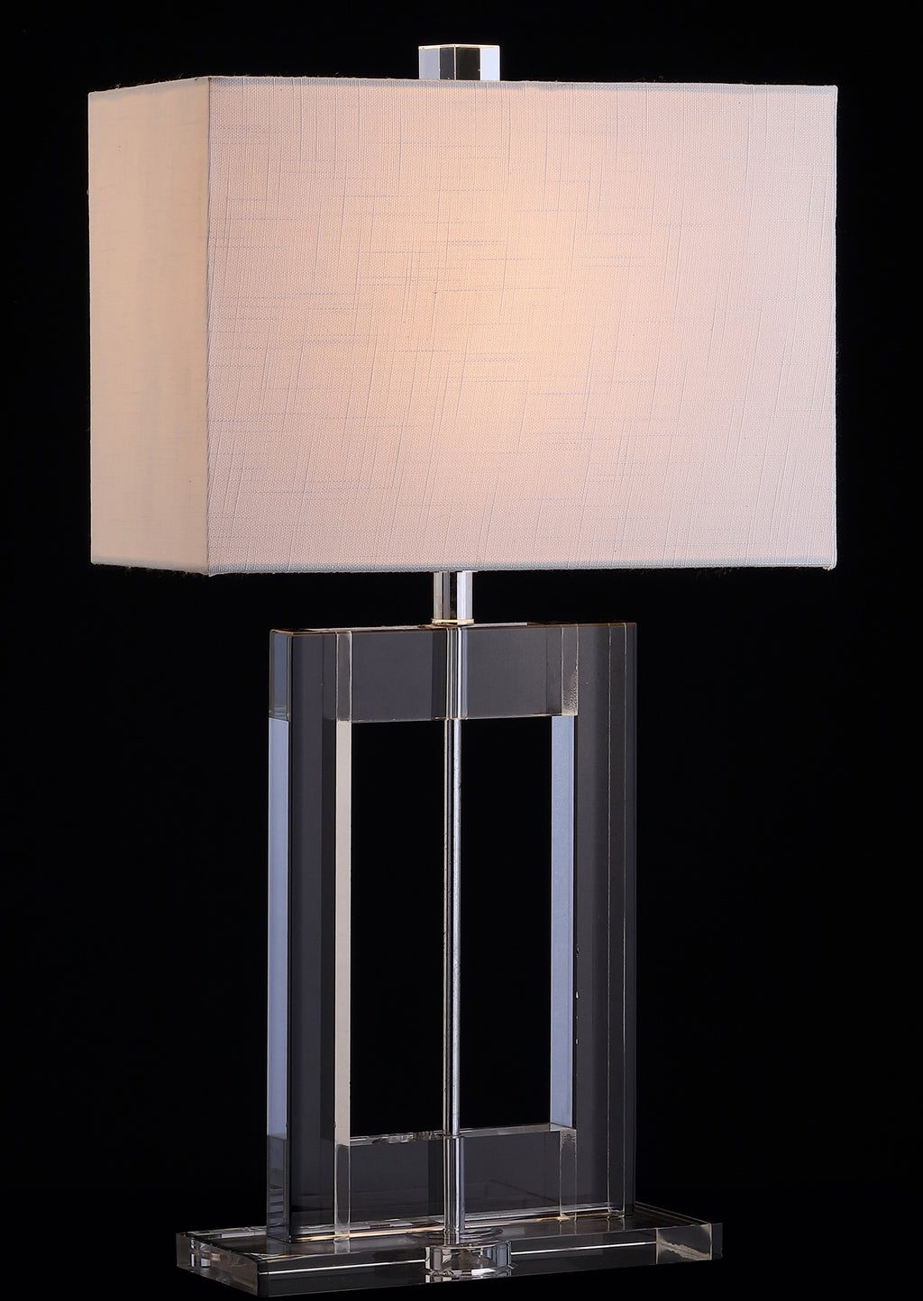 Classic crystal gets a modern update with the black edging on this geometric table lamp. Perfect for contemporary spaces seeking a little luxe, the chrome and crystal base topped with a large cotton box shade would be a sleek addition to any room. Try It on a dresser or on a dining room buffet, where the warm glow of the included LED bulb can help set a serene ambiance for entertaining or relaxation.