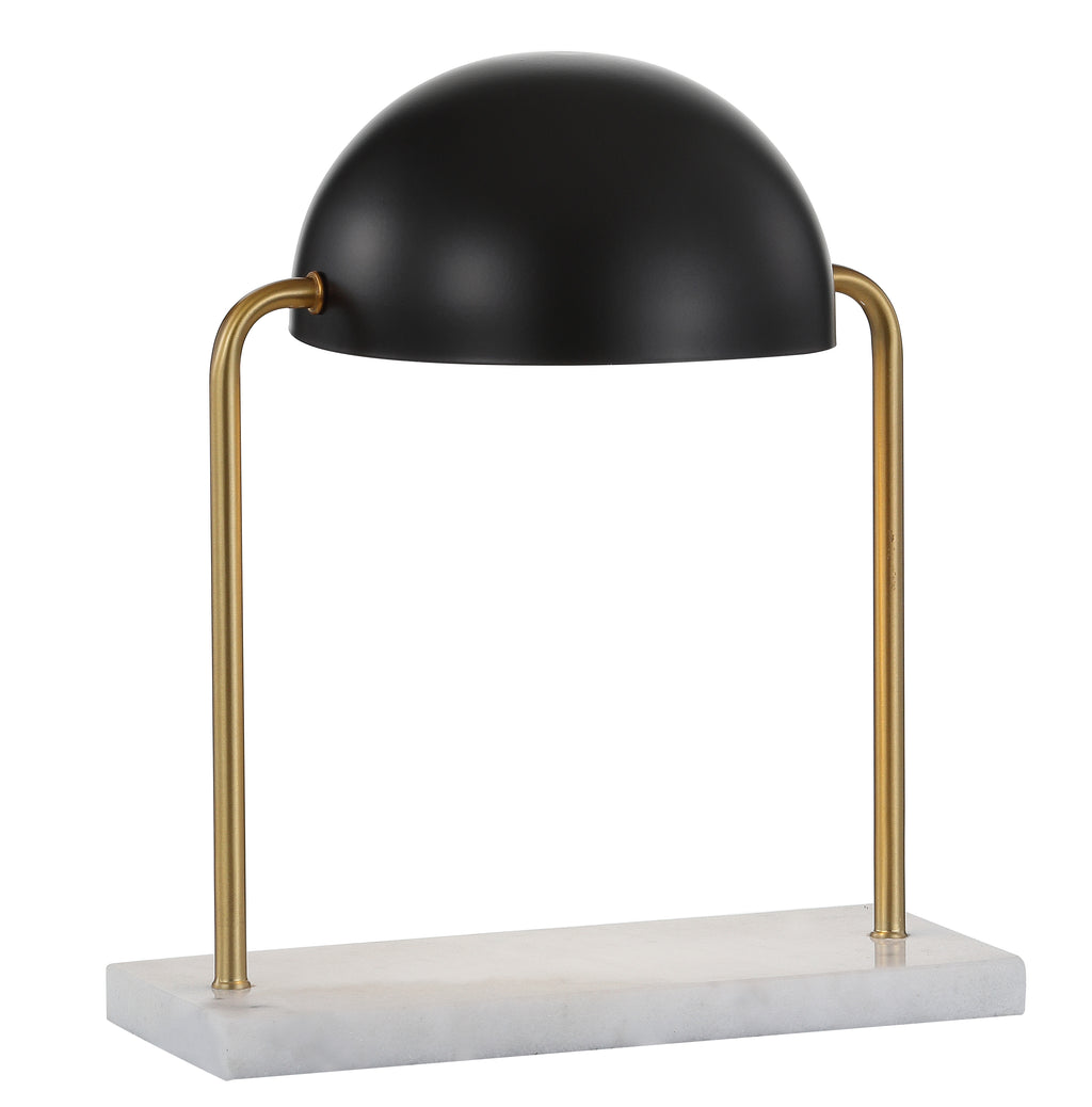 With its sleek, minimalist lines and brass-gold metallic finish, this table lamp has a modern, Art-Deco-inspired aesthetic. A matte-finish black metal shade directs light downwards onto the marble base. Make a statement with this stylish lamp on a desk or table.